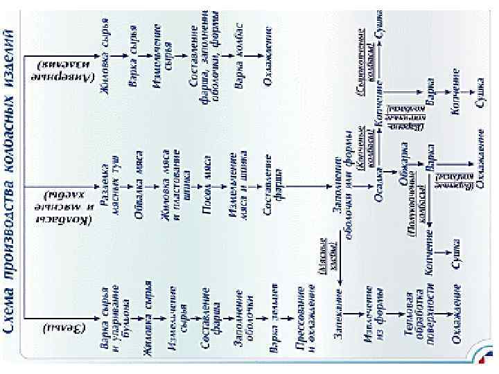 Схема производства колбасных изделий ЗЕЛЬЦ Колбасы и мясные хлебы Ливерные изделия ВАРКА СЫРЬЯ И УПАРИВАНИЕ БУЛЬОНА Разделка мясных туш Жиловка сырья Обвалка мяса Варка сырья Измельчение сырья Жиловка мяса и пластование шпика Измельчение сырья Составление фарша Заполнение оболочки Варка зельцев Прессование и охлаждение Запекание Тепловая обработка поверхности Охлаждение Измельчение мяса и шпика Варка колбас Составление фарша Заполнение оболочки и формы е Мясны хлебы Полукоп ченые колбасы Копчение Сушка Осадка Охлаждение Копченые колбасы Сырокопченые колбасы КОПЧЕНИЕ Обжарка Вареные колбасы Варено-копченые колбасы Варка Копчение Охлаждение Сушка СУШКА Извлечение из формы Составление фарша, заполнение оболочки, формы Посол мяса
