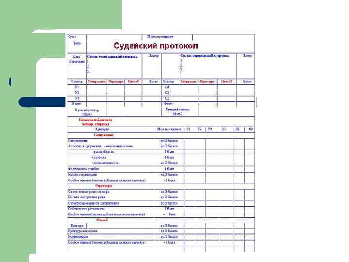 Схема проведения дебатов l l l l l У 1 – 6 минут Вопросы О 3 к У О 1 – 6 минут Вопросы У 3 к О У 2 – 5 минут Вопросы О 1 к У О 2 – 5 минут Вопросы У 1 к О У 3 – 5 минут О 3 – 5 минут 1 – 3 минуты 2 – 3 минуты