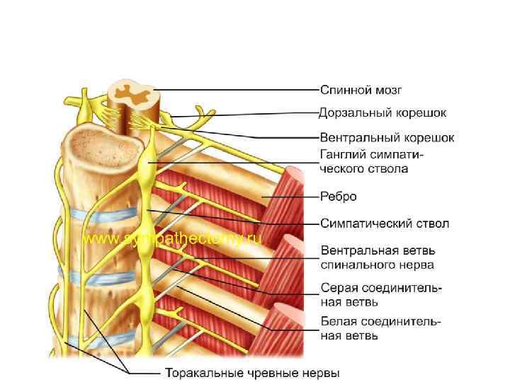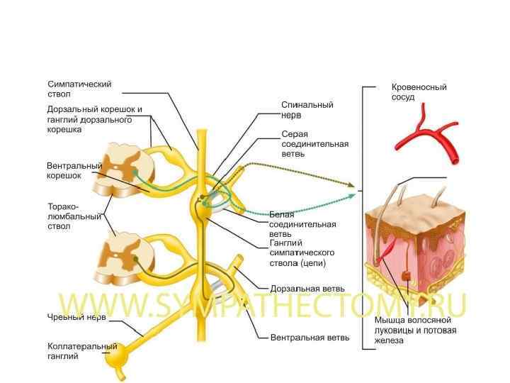 1 центр симпатической нервной системы в спинном мозге 2 передняя фиссура 3 передний рог 4 передний канатик 5 передний рог 6 спинальный нерв 7 белая соединительная ветвь 8 волокна к симпатическому ганглию 9 постганглионарные волокна 10 постганглионарные волокна 11 какой либо внутренний орган 12 ганглий автономного сплетения 13 преганглионарные волокна 14 постганглионарные волокна 15 симпатический ганглий 16 межганглионарные ветви 17 афферентные волокна 18 серая соединительная ветвь 19 кожа боковой и передней части тела 20 мышца 21 передняя ветвь 22 двигательные волокна 23 задняя ветвь 24 мышща 25 кожа задней поверхности тела 26 афферентные волокна 27 спинальный ганглий 28 задний корешок 29 передний корешок 30 боковой канатик 31 задний рог 32 боковой рог