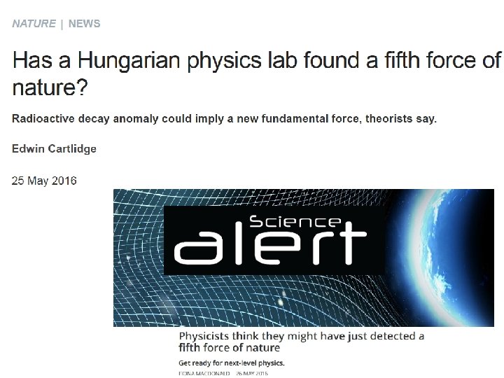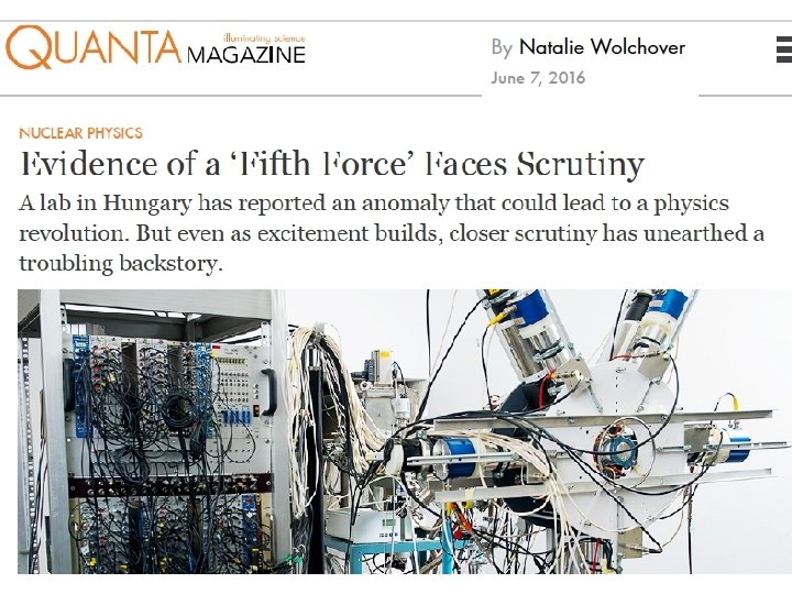 Can nuclear physics explain the anomaly observed in the internal pair production in the Beryllium-8 nucleus? Xilin Zhang, Gerald A. Miller, (Submitted on 14 Mar 2017), ar. Xiv: 1703. 04588 [nucl-th] Particle Physics Models for the 17 Me. V Anomaly in Beryllium Nuclear Decays Jonathan L. Feng, Bartosz Fornal, Iftah Galon, Susan Gardner, Jordan Smolinsky, Tim M. P. Tait, Philip Tanedo, Phys. Rev. D 95, 035017 (2017) On going and planed new experiments