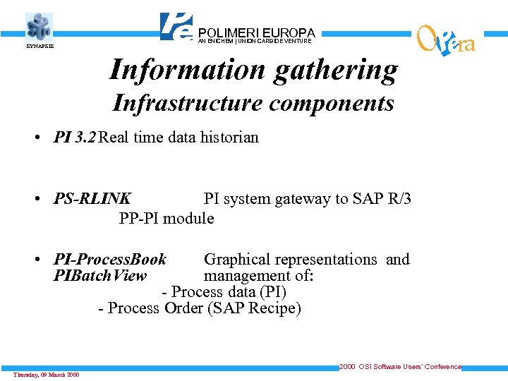 SYNAPSIS POLIMERICARBIDE VENTURE EUROPA AN ENICHEM | UNION Information gathering O ra Infrastructure components • PI 3. 2 Real time data historian • PS-RLINK PI system gateway to SAP R/3 PP-PI module • PI-Process. Book Graphical representations and PIBatch. View management of: - Process data (PI) - Process Order (SAP Recipe) 2000 OSI Software Users’ Conference Thursday, 09 March 2000