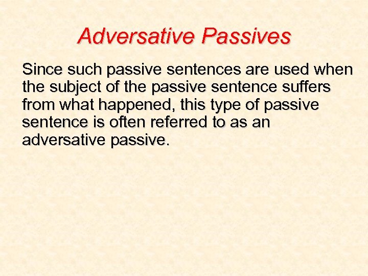Adversative Passives Since such passive sentences are used when the subject of the passive sentence suffers from what happened, this type of passive sentence is often referred to as an adversative passive.