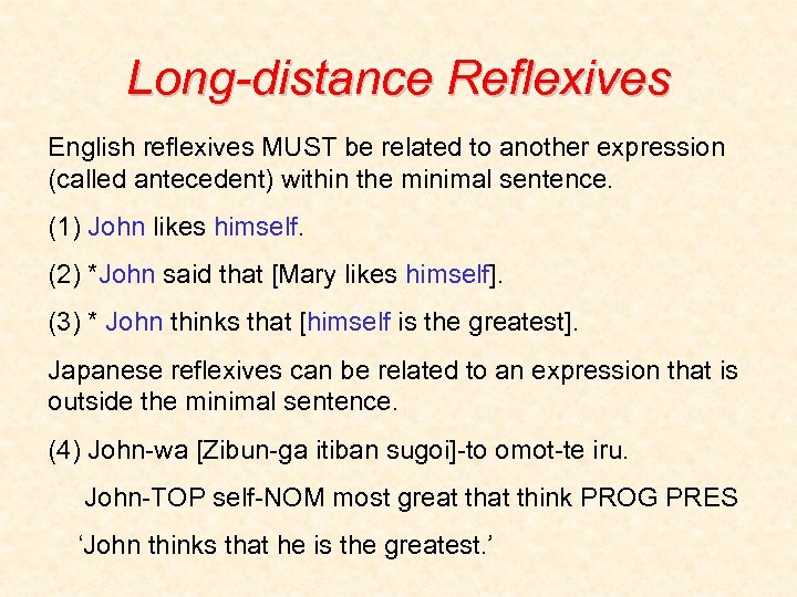 Long-distance Reflexives English reflexives MUST be related to another expression (called antecedent) within the minimal sentence. (1) John likes himself. (2) *John said that [Mary likes himself]. (3) * John thinks that [himself is the greatest]. Japanese reflexives can be related to an expression that is outside the minimal sentence. (4) John-wa [Zibun-ga itiban sugoi]-to omot-te iru. John-TOP self-NOM most great think PROG PRES ‘John thinks that he is the greatest. ’