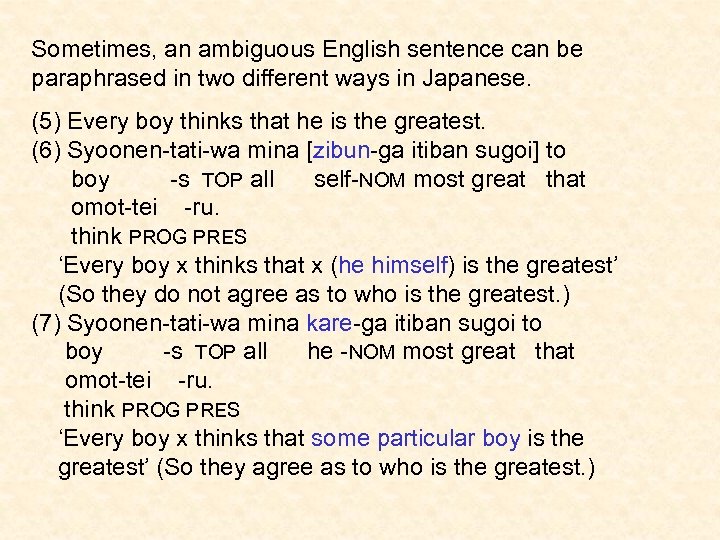 Sometimes, an ambiguous English sentence can be paraphrased in two different ways in Japanese. (5) Every boy thinks that he is the greatest. (6) Syoonen-tati-wa mina [zibun-ga itiban sugoi] to boy -s TOP all self-NOM most great that omot-tei -ru. think PROG PRES ‘Every boy x thinks that x (he himself) is the greatest’ (So they do not agree as to who is the greatest. ) (7) Syoonen-tati-wa mina kare-ga itiban sugoi to boy -s TOP all he -NOM most great that omot-tei -ru. think PROG PRES ‘Every boy x thinks that some particular boy is the greatest’ (So they agree as to who is the greatest. )