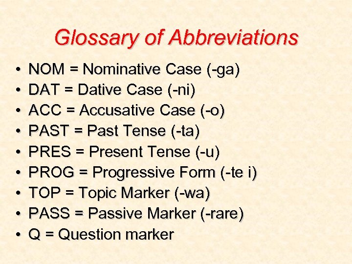 Glossary of Abbreviations • • • NOM = Nominative Case (-ga) DAT = Dative Case (-ni) ACC = Accusative Case (-o) PAST = Past Tense (-ta) PRES = Present Tense (-u) PROG = Progressive Form (-te i) TOP = Topic Marker (-wa) PASS = Passive Marker (-rare) Q = Question marker