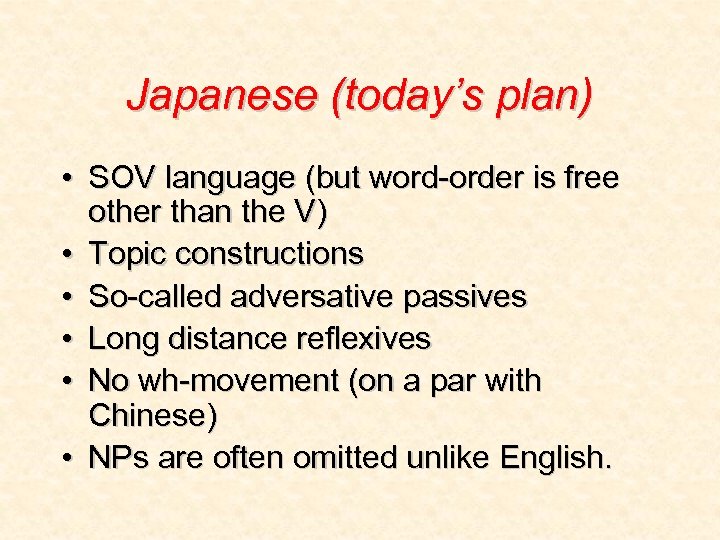 Japanese (today’s plan) • SOV language (but word-order is free other than the V) • Topic constructions • So-called adversative passives • Long distance reflexives • No wh-movement (on a par with Chinese) • NPs are often omitted unlike English.