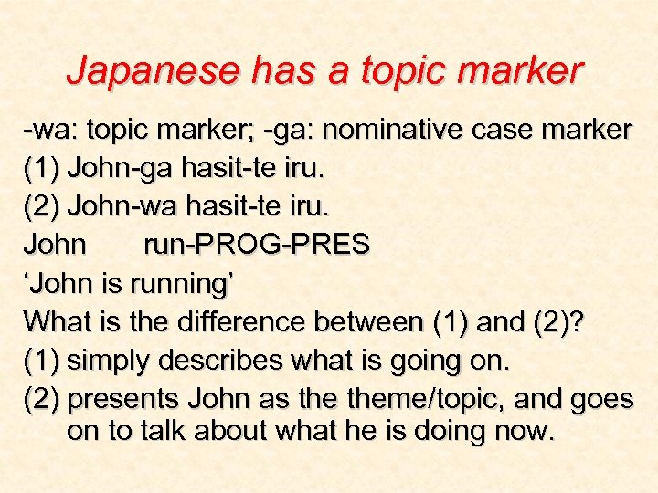Japanese has a topic marker -wa: topic marker; -ga: nominative case marker (1) John-ga hasit-te iru. (2) John-wa hasit-te iru. John run-PROG-PRES ‘John is running’ What is the difference between (1) and (2)? (1) simply describes what is going on. (2) presents John as theme/topic, and goes on to talk about what he is doing now.