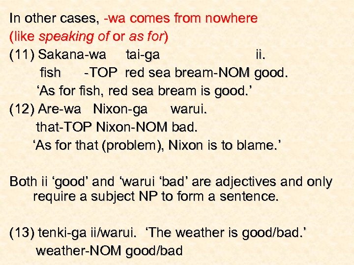 In other cases, -wa comes from nowhere (like speaking of or as for) (11) Sakana-wa tai-ga ii. fish -TOP red sea bream-NOM good. ‘As for fish, red sea bream is good. ’ (12) Are-wa Nixon-ga warui. that-TOP Nixon-NOM bad. ‘As for that (problem), Nixon is to blame. ’ Both ii ‘good’ and ‘warui ‘bad’ are adjectives and only require a subject NP to form a sentence. (13) tenki-ga ii/warui. ‘The weather is good/bad. ’ weather-NOM good/bad