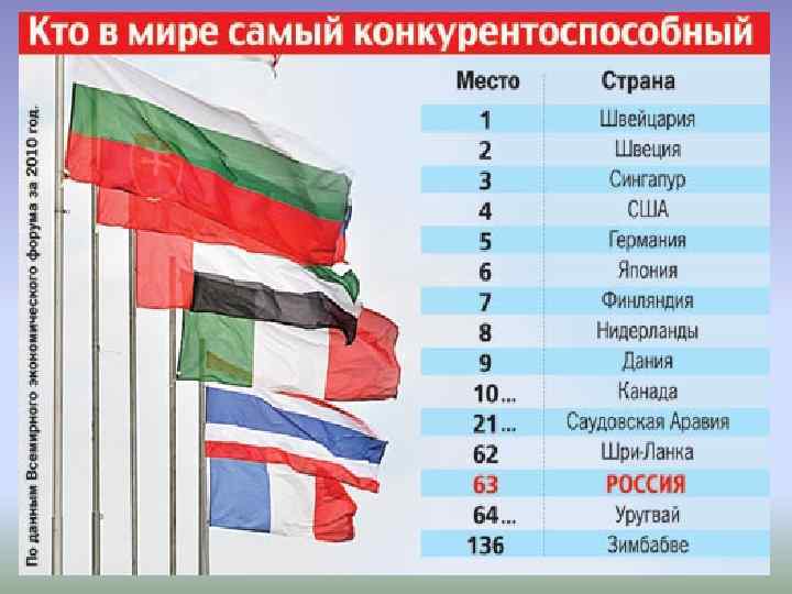Несмотря на наличие большого внутреннего рынка, весьма качественной рабочей силой, а также богатых природных ресурсов Россия находится на 63 месте по уровню конкурентоспособности стран Это объясняется крайне плохими показателями развития практически по всем направлениям, которые участвуют в расчете. Так, например, развитие финансовых рынков в России занимает 130 место, по антимонопольной политике - 124. Только макроэкономическая ситуация, тут страна как раз поднялась на 22 место с 45.