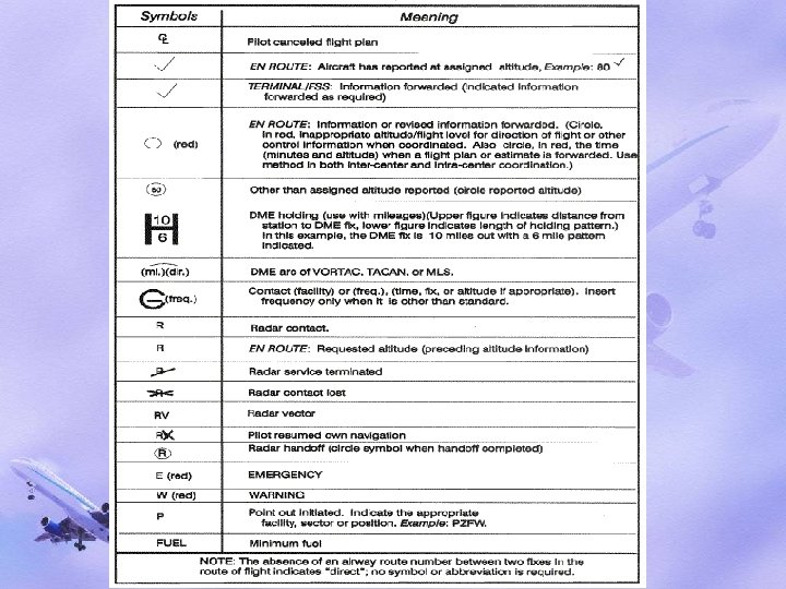 Doporučené značky používané v stripoch. ( najčastejšie v poznámke ) Odlet Prílet Stúpanie Klesanie x Prelet 60 Dosiahnutie FL E EMERGENCY W WARNING RV Pilot pokračuje vlastnou navigáciou FUEL Minimum paliva ( zakrúžkuje sa, až pilot ohlási dosiahnutie )