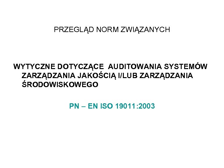 PRZEGLĄD NORM ZWIĄZANYCH WYTYCZNE DOTYCZĄCE AUDITOWANIA SYSTEMÓW ZARZĄDZANIA JAKOŚCIĄ I/LUB ZARZĄDZANIA ŚRODOWISKOWEGO PN – EN ISO 19011: 2003