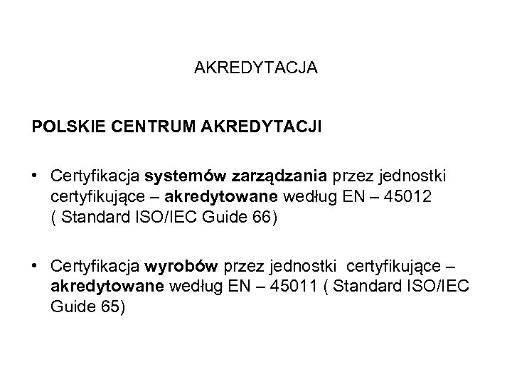 AKREDYTACJA POLSKIE CENTRUM AKREDYTACJI • Certyfikacja systemów zarządzania przez jednostki certyfikujące – akredytowane według EN – 45012 ( Standard ISO/IEC Guide 66) • Certyfikacja wyrobów przez jednostki certyfikujące – akredytowane według EN – 45011 ( Standard ISO/IEC Guide 65)