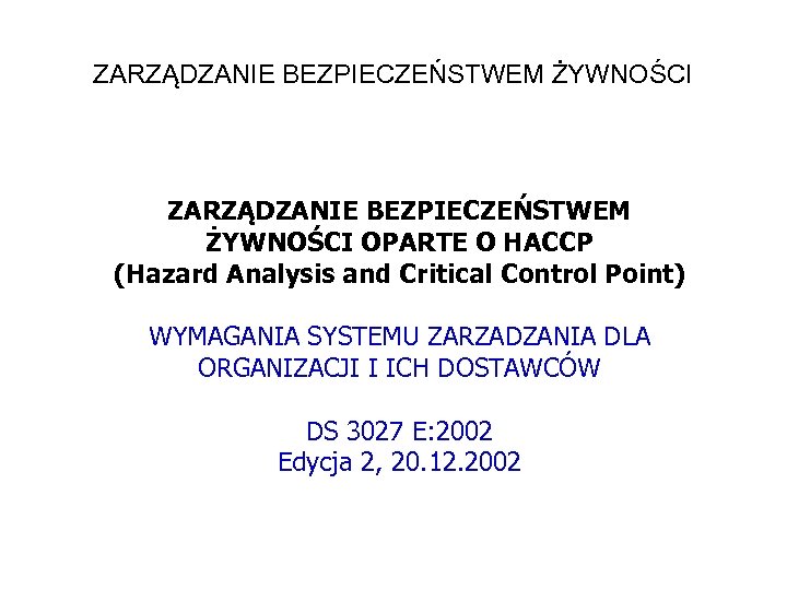 ZARZĄDZANIE BEZPIECZEŃSTWEM ŻYWNOŚCI OPARTE O HACCP (Hazard Analysis and Critical Control Point) WYMAGANIA SYSTEMU ZARZADZANIA DLA ORGANIZACJI I ICH DOSTAWCÓW DS 3027 E: 2002 Edycja 2, 20. 12. 2002