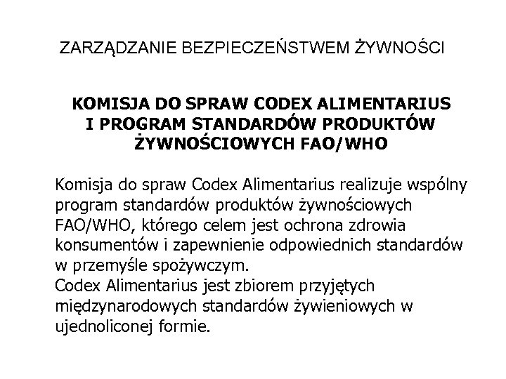 ZARZĄDZANIE BEZPIECZEŃSTWEM ŻYWNOŚCI KOMISJA DO SPRAW CODEX ALIMENTARIUS I PROGRAM STANDARDÓW PRODUKTÓW ŻYWNOŚCIOWYCH FAO/WHO Komisja do spraw Codex Alimentarius realizuje wspólny program standardów produktów żywnościowych FAO/WHO, którego celem jest ochrona zdrowia konsumentów i zapewnienie odpowiednich standardów w przemyśle spożywczym. Codex Alimentarius jest zbiorem przyjętych międzynarodowych standardów żywieniowych w ujednoliconej formie.