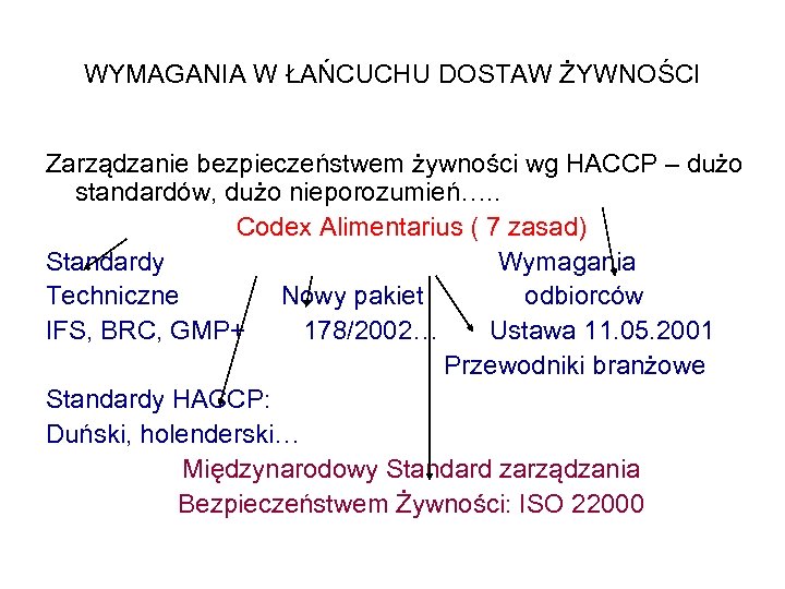 WYMAGANIA W ŁAŃCUCHU DOSTAW ŻYWNOŚCI Zarządzanie bezpieczeństwem żywności wg HACCP – dużo standardów, dużo nieporozumień…. . Codex Alimentarius ( 7 zasad) Standardy Wymagania Techniczne Nowy pakiet odbiorców IFS, BRC, GMP+ 178/2002… Ustawa 11. 05. 2001 Przewodniki branżowe Standardy HACCP: Duński, holenderski… Międzynarodowy Standard zarządzania Bezpieczeństwem Żywności: ISO 22000