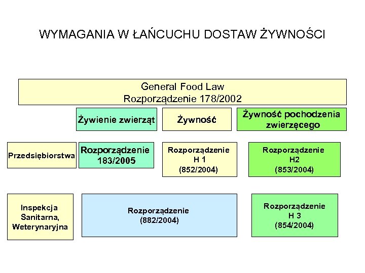 WYMAGANIA W ŁAŃCUCHU DOSTAW ŻYWNOŚCI General Food Law Rozporządzenie 178/2002 Żywienie zwierząt Przedsiębiorstwa Inspekcja Sanitarna, Weterynaryjna Żywność pochodzenia zwierzęcego Rozporządzenie 183/2005 Rozporządzenie H 1 (852/2004) Rozporządzenie H 2 (853/2004) Rozporządzenie (882/2004) Rozporządzenie H 3 (854/2004)