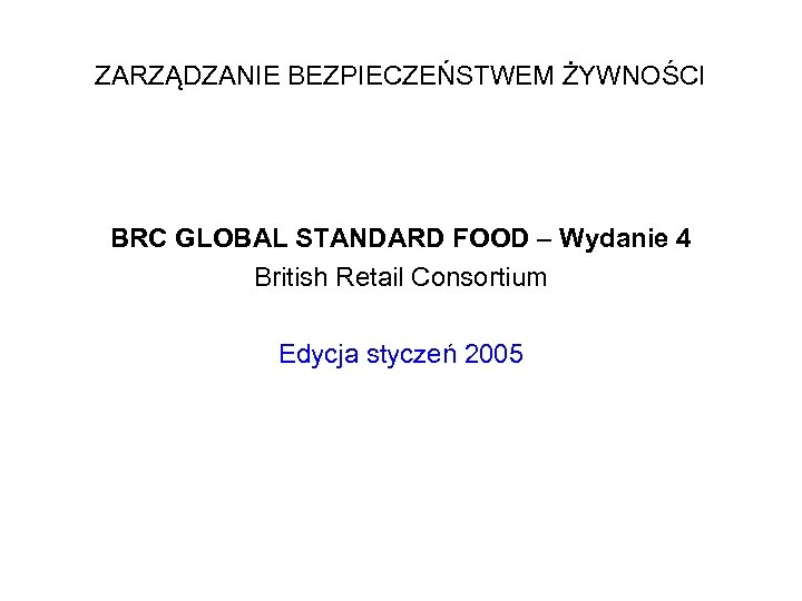 ZARZĄDZANIE BEZPIECZEŃSTWEM ŻYWNOŚCI BRC GLOBAL STANDARD FOOD – Wydanie 4 British Retail Consortium Edycja styczeń 2005