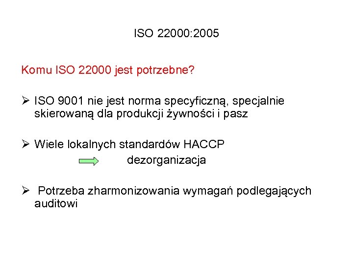 ISO 22000: 2005 Komu ISO 22000 jest potrzebne? Ø ISO 9001 nie jest norma specyficzną, specjalnie skierowaną dla produkcji żywności i pasz Ø Wiele lokalnych standardów HACCP dezorganizacja Ø Potrzeba zharmonizowania wymagań podlegających auditowi