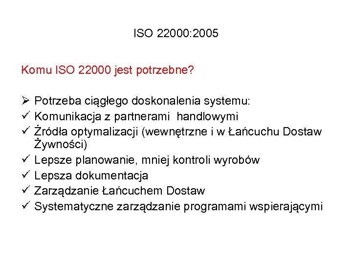 ISO 22000: 2005 Komu ISO 22000 jest potrzebne? Ø Potrzeba ciągłego doskonalenia systemu: ü Komunikacja z partnerami handlowymi ü Źródła optymalizacji (wewnętrzne i w Łańcuchu Dostaw Żywności) ü Lepsze planowanie, mniej kontroli wyrobów ü Lepsza dokumentacja ü Zarządzanie Łańcuchem Dostaw ü Systematyczne zarządzanie programami wspierającymi