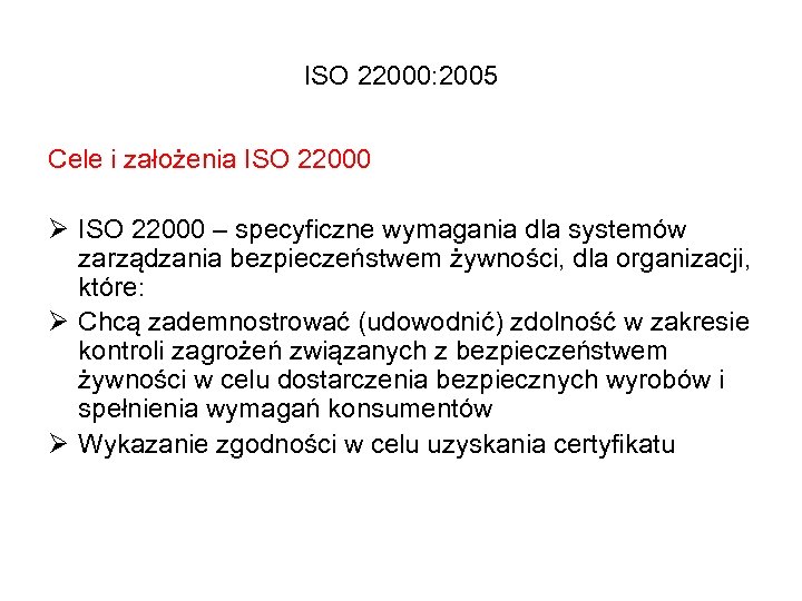ISO 22000: 2005 Cele i założenia ISO 22000 Ø ISO 22000 – specyficzne wymagania dla systemów zarządzania bezpieczeństwem żywności, dla organizacji, które: Ø Chcą zademnostrować (udowodnić) zdolność w zakresie kontroli zagrożeń związanych z bezpieczeństwem żywności w celu dostarczenia bezpiecznych wyrobów i spełnienia wymagań konsumentów Ø Wykazanie zgodności w celu uzyskania certyfikatu