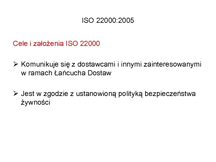 ISO 22000: 2005 Cele i założenia ISO 22000 Ø Komunikuje się z dostawcami i innymi zainteresowanymi w ramach Łańcucha Dostaw Ø Jest w zgodzie z ustanowioną polityką bezpieczeństwa żywności