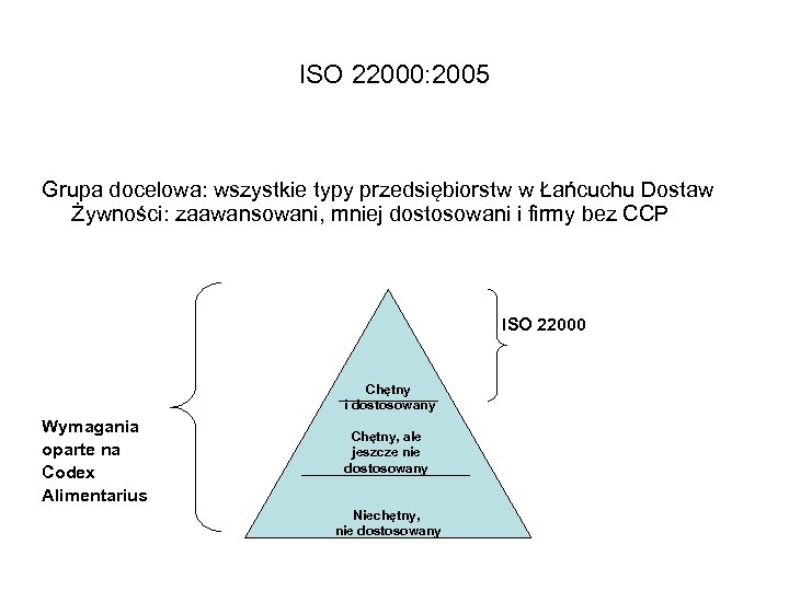 ISO 22000: 2005 Grupa docelowa: wszystkie typy przedsiębiorstw w Łańcuchu Dostaw Żywności: zaawansowani, mniej dostosowani i firmy bez CCP ISO 22000 Chętny i dostosowany Wymagania oparte na Codex Alimentarius Chętny, ale jeszcze nie dostosowany Niechętny, nie dostosowany