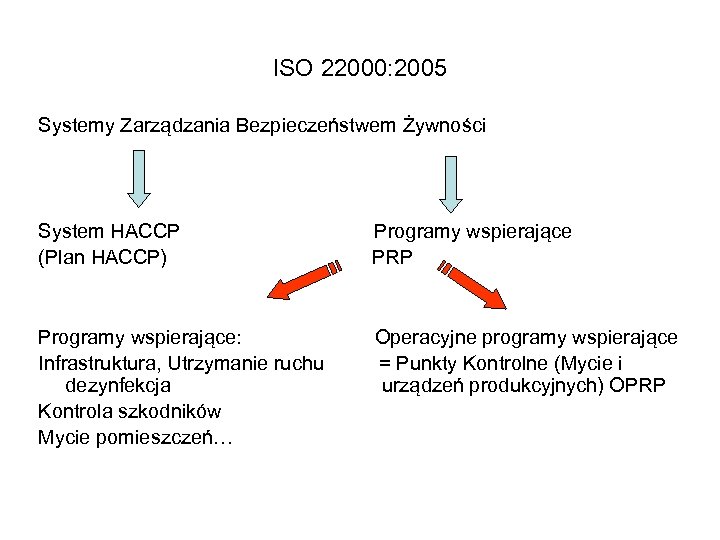 ISO 22000: 2005 Systemy Zarządzania Bezpieczeństwem Żywności System HACCP (Plan HACCP) Programy wspierające PRP Programy wspierające: Infrastruktura, Utrzymanie ruchu dezynfekcja Kontrola szkodników Mycie pomieszczeń… Operacyjne programy wspierające = Punkty Kontrolne (Mycie i urządzeń produkcyjnych) OPRP
