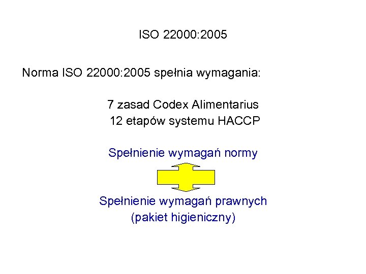 ISO 22000: 2005 Norma ISO 22000: 2005 spełnia wymagania: 7 zasad Codex Alimentarius 12 etapów systemu HACCP Spełnienie wymagań normy Spełnienie wymagań prawnych (pakiet higieniczny)