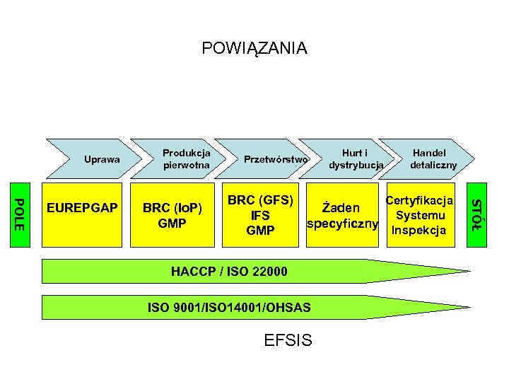 POWIĄZANIA Uprawa BRC (Io. P) GMP Przetwórstwo BRC (GFS) IFS GMP Hurt i dystrybucja Żaden specyficzny HACCP / ISO 22000 ISO 9001/ISO 14001/OHSAS EFSIS Handel detaliczny Certyfikacja Systemu Inspekcja STÓŁ POLE EUREPGAP Produkcja pierwotna
