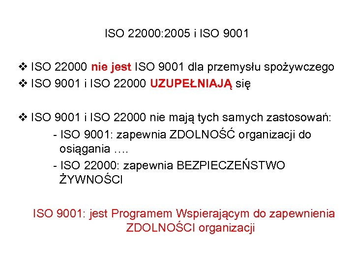 ISO 22000: 2005 i ISO 9001 v ISO 22000 nie jest ISO 9001 dla przemysłu spożywczego v ISO 9001 i ISO 22000 UZUPEŁNIAJĄ się v ISO 9001 i ISO 22000 nie mają tych samych zastosowań: - ISO 9001: zapewnia ZDOLNOŚĆ organizacji do osiągania …. - ISO 22000: zapewnia BEZPIECZEŃSTWO ŻYWNOŚCI ISO 9001: jest Programem Wspierającym do zapewnienia ZDOLNOŚCI organizacji