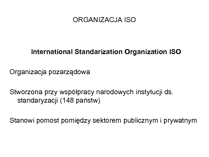 ORGANIZACJA ISO International Standarization Organization ISO Organizacja pozarządowa Stworzona przy współpracy narodowych instytucji ds. standaryzacji (148 państw) Stanowi pomost pomiędzy sektorem publicznym i prywatnym