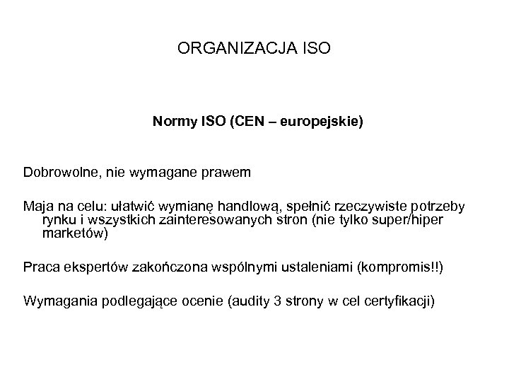 ORGANIZACJA ISO Normy ISO (CEN – europejskie) Dobrowolne, nie wymagane prawem Maja na celu: ułatwić wymianę handlową, spełnić rzeczywiste potrzeby rynku i wszystkich zainteresowanych stron (nie tylko super/hiper marketów) Praca ekspertów zakończona wspólnymi ustaleniami (kompromis!!) Wymagania podlegające ocenie (audity 3 strony w cel certyfikacji)