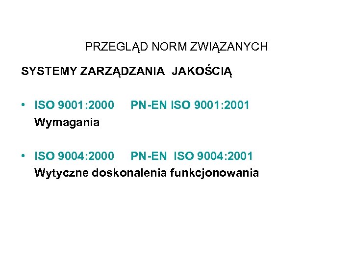 PRZEGLĄD NORM ZWIĄZANYCH SYSTEMY ZARZĄDZANIA JAKOŚCIĄ • ISO 9001: 2000 Wymagania PN-EN ISO 9001: 2001 • ISO 9004: 2000 PN-EN ISO 9004: 2001 Wytyczne doskonalenia funkcjonowania