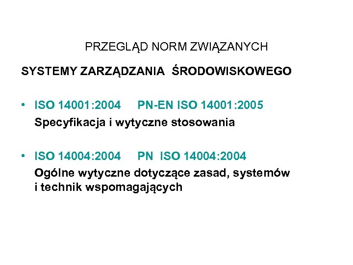 PRZEGLĄD NORM ZWIĄZANYCH SYSTEMY ZARZĄDZANIA ŚRODOWISKOWEGO • ISO 14001: 2004 PN-EN ISO 14001: 2005 Specyfikacja i wytyczne stosowania • ISO 14004: 2004 PN ISO 14004: 2004 Ogólne wytyczne dotyczące zasad, systemów i technik wspomagających