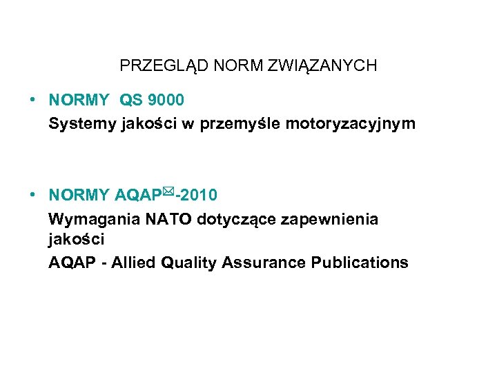 PRZEGLĄD NORM ZWIĄZANYCH • NORMY QS 9000 Systemy jakości w przemyśle motoryzacyjnym • NORMY AQAP -2010 Wymagania NATO dotyczące zapewnienia jakości AQAP - Allied Quality Assurance Publications
