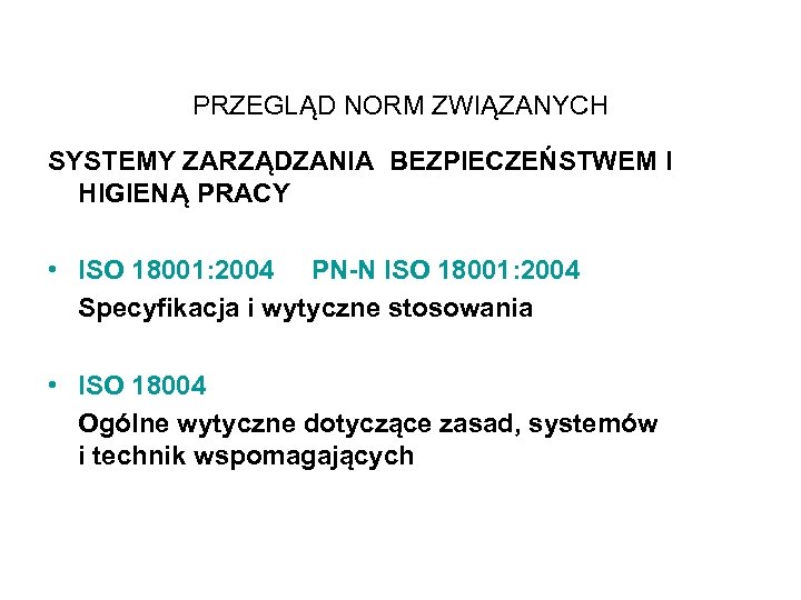 PRZEGLĄD NORM ZWIĄZANYCH SYSTEMY ZARZĄDZANIA BEZPIECZEŃSTWEM I HIGIENĄ PRACY • ISO 18001: 2004 PN-N ISO 18001: 2004 Specyfikacja i wytyczne stosowania • ISO 18004 Ogólne wytyczne dotyczące zasad, systemów i technik wspomagających