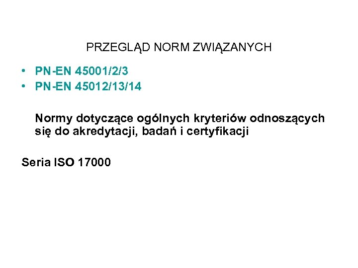PRZEGLĄD NORM ZWIĄZANYCH • PN-EN 45001/2/3 • PN-EN 45012/13/14 Normy dotyczące ogólnych kryteriów odnoszących się do akredytacji, badań i certyfikacji Seria ISO 17000