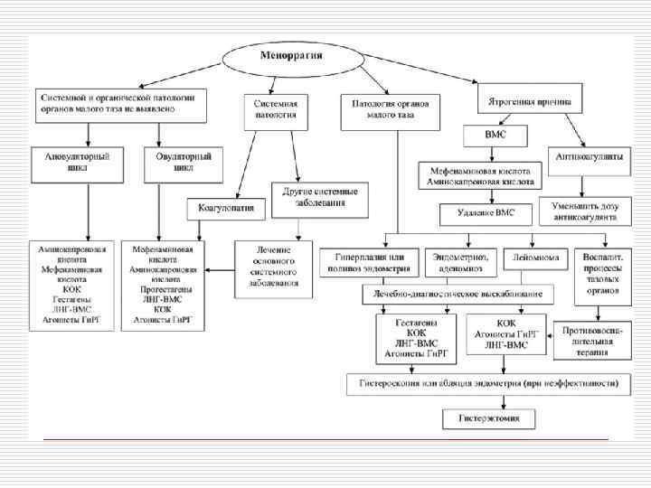 АМК в перименопаузе и постменопаузе 1 и этап — остановка маточного кровотечения. При наличии внутриматочнои патологии — гистероскопия и раздельное диагностическое выскабливание, резектоскопия, аблация эндометрия или гистерэктомия в зависимости от вида выявленнои патологии. При отсутствии органических причин кровотечения — симптоматическая гемостатическая терапия или гормональныи гемостаз с предварительным исследованием системы гемостаза; ●мефенамовои кислоты 1500 мг/сут; ●флурбипрофена 200 мг/сут; ●напроксена 750 мг/сут. o ●транексамовую кислоту 3– 6 г/сут; ●аминометилбензои ную кислоту 750 мг/сут. при экстрагенитальнои патологии — лечение основного заболевания. o 2 и этап — лечение выявленнои патологии (медикаментозное или хирургическое) с целью профилактики рецидивов кровотечения.