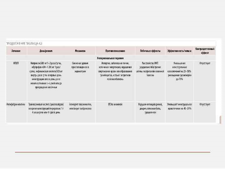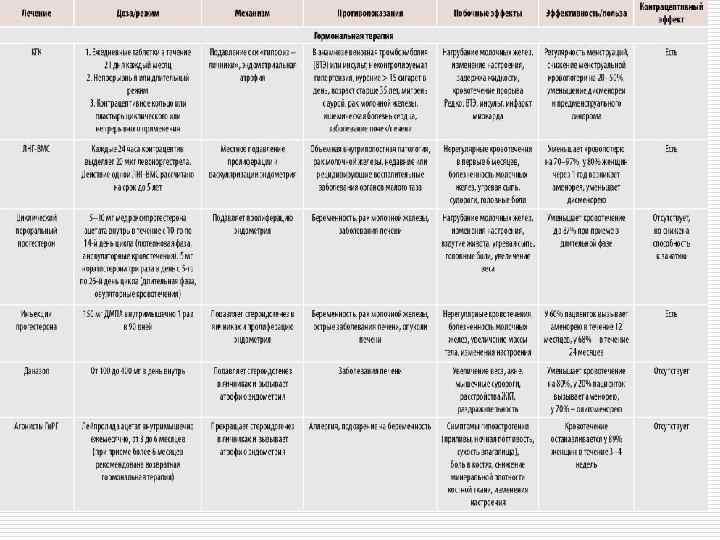 Консервативная терапия o o o Антифибринолитики: транексамовая кислота 250 -500 мг каждые 6 -8 часов НПВП напроксен и мефенаминовая кислота 250 -500 мг. 2 -4 раза в сутки, кетопрофен и ибупрофен 600 мг в сутки Гормональная: этинилэстрадиол 30 мкг – диеногест 2 мг, ● этинилэстрадиол 20 мкг – гестоден 75 мг, ● этинилэстрадиол 20 мкг – дезогестрел 150 мкг, ежедневные таблетки в течение 21 дня каждый месяц с 7 дневным перерывов или непрерывный прием