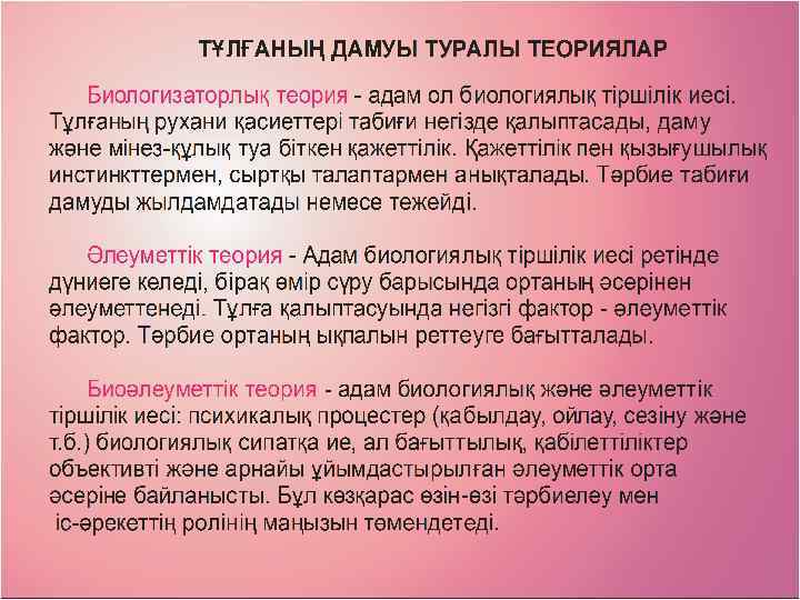 Қорытынды Тұлға дамуының мәселелерін қарастырған авторлар адам дамуының шарты болып табылатын себептерді анықтауға тырысады. Көптеген зерттеушілердің ойынша тұлға дамуынынң қозғаушы күші түрлі қажеттіліктердің кешені. Олардың ішіндегі маңызды орын алатыны - өзін өзі дамыту қажеттілігі. Тұлға үшін нақты мақсатқа жету немесе белгілі әлеуметтік статус алу маңыздырақ.