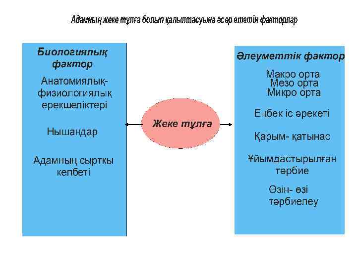 Тұлғаның қалыптасуы – барлық факторлардың (экологиялық, экономикалық, әлеуметтік, биологиялық және т. б. ) әсерінен индивидтің тұлғаға айналу процесі. Тұлғаның дамуы - адамның ағзасындағы сандық және сапалық өлшемдердің өзгеру процесі. Тұлғаның тәрбиеленуі -тұлғаның аға ұрпақтың әлеуметтік тәжірибелерін меңгеру процесі.