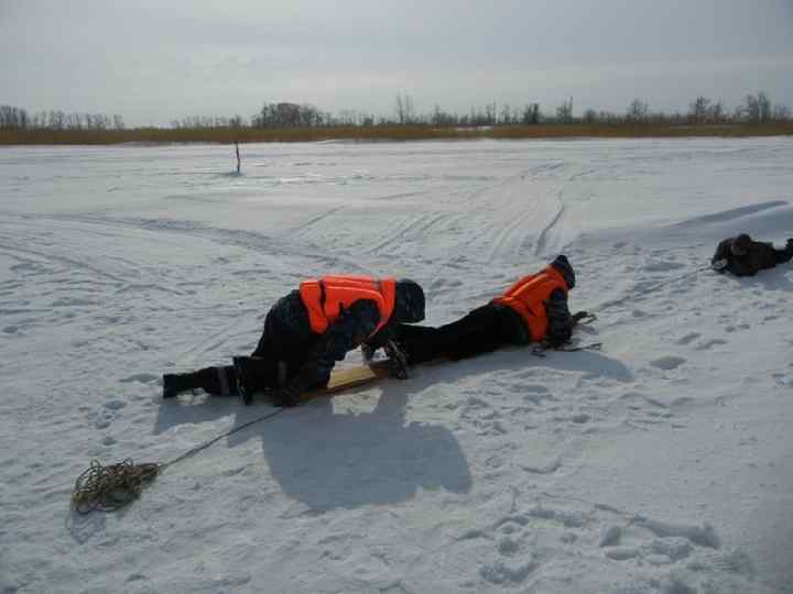 Егер Сіз мұз астына құлап кетсеңіз • Адам суға түсіп кеткен жағдайда ауыр заттардан құтылу керек. • сасқалақтамаңыз, жоғарыда (судың бетінде) қалау үшін дереу екі қолды мұз үстіне жазып жіберіңіздер. Көмекке шақырыңыздар. Сіздің денеңіз бен киім арасындаға ауа сізді қандай да бір уақыт ұстап тұратынын естен шығармаңыздар. Мұздың жиегіне арқаға жатып, жиектің қарамақарсы жағына оң аяқпен тіреліп, сол аяқты жігермен мұзға шығарыңыз. Мұзға шыққаннан соң, келген жағыңызға қарай еңбектей жылжыңыз.