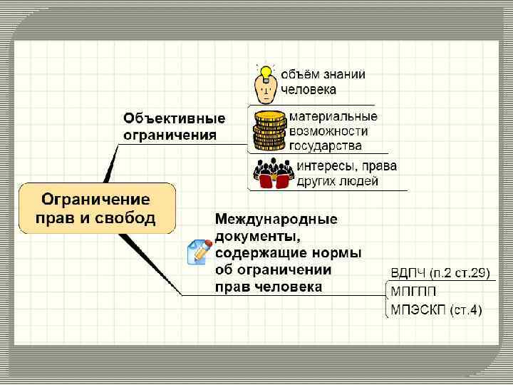 Права и свободы РАЗЛИЧНЫЕ ПОДХОДЫ: ПРАВА СВОБОДЫ 1) Конкретные действия человека. 2) Позитивные права – предполагают активную обязанность государства по отношению к человеку. 1) Более широкие возможности индивидуального выбора. 2) Негативные права - налагаемые на власть запреты вмешиваться в определенную сферу жизни. Различия условны, применимы не во всех случаях