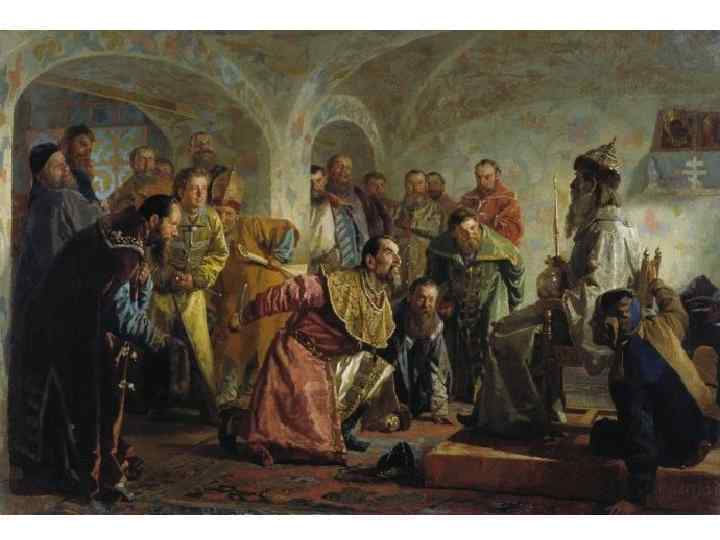 В 1547 г. Иван IV (родился в 1530 г. ) достиг совершеннолетия и венчался на царство, официально приняв титул царя и великого князя «всея Руси» . Причины: • • он формально объявил о своей независимости перед своим прежним сюзереном – монгольским царем. Византийская империя была разрушена турками, и, таким образом, греческий православный мир жил без царя. И к тому же согласно византийской теории "гармонии" церкви и государства христианское общество нуждалось в двух главах – царе и патриархе.