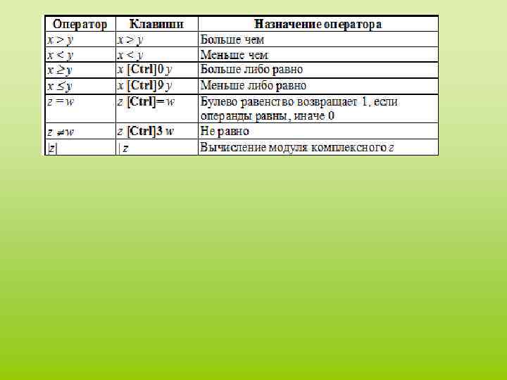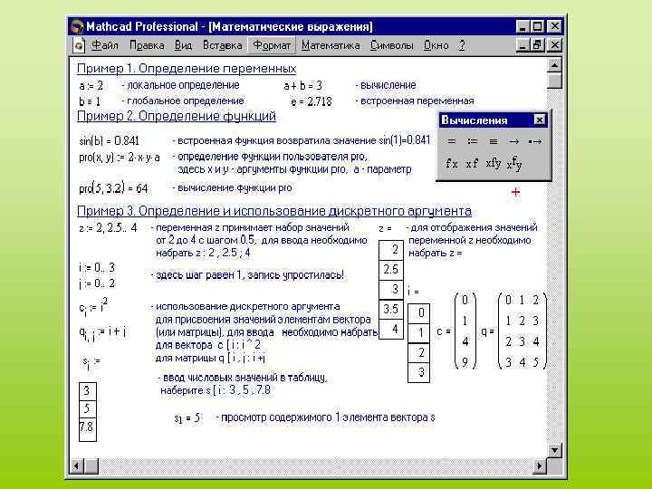 Существуют также жирный знак равенства = (комбинация клавиш Ctrl + =), который используется, например, как оператор приближенного равенства при решении систем уравнений, и символьный знак равенства (комбинация клавиш Ctrl + , результат выводится в символьном виде). В математическом процессоре Math. Cad заложен последовательный принцип расчетов — значения всех переменных, которые используются в математическом выражении, должны быть определены заранее. Важно следить за тем, чтобы все переменные и функции были определены левее и/или выше тех выражений, где они используются.