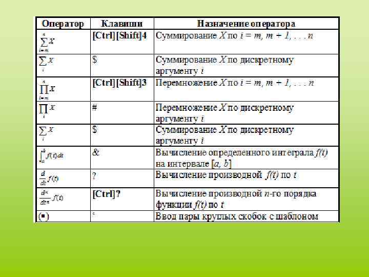 Операторы - элементы Math. CAD, с помощью которых можно создавать математические выражения. К ним, например, относятся символы арифметических операций, знаки вычисления сумм, произведений, производной и интеграла и т. д. Оператор определяет: • действие, которое должно выполняться при наличии тех или иных значений операндов; • сколько, где и какие операнды должны быть введены в оператор. Операнд – число или выражение, на которое действует оператор. Например, в выражении 5! + 3 число 3 и выражение 5! – операнды оператора + (плюс), а число 5 операнд оператора факториал (!). После указания операндов операторы становятся исполняемыми по документу блоками.