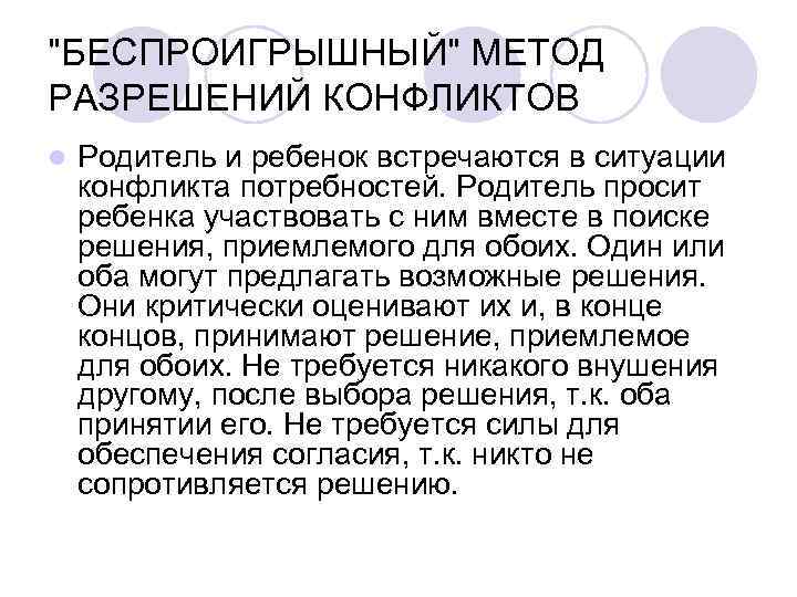 "БЕСПРОИГРЫШНЫЙ" МЕТОД РАЗРЕШЕНИЙ КОНФЛИКТОВ l Родитель и ребенок встречаются в ситуации конфликта потребностей. Родитель просит ребенка участвовать с ним вместе в поиске решения, приемлемого для обоих. Один или оба могут предлагать возможные решения. Они критически оценивают их и, в конце концов, принимают решение, приемлемое для обоих. Не требуется никакого внушения другому, после выбора решения, т. к. оба принятии его. Не требуется силы для обеспечения согласия, т. к. никто не сопротивляется решению.