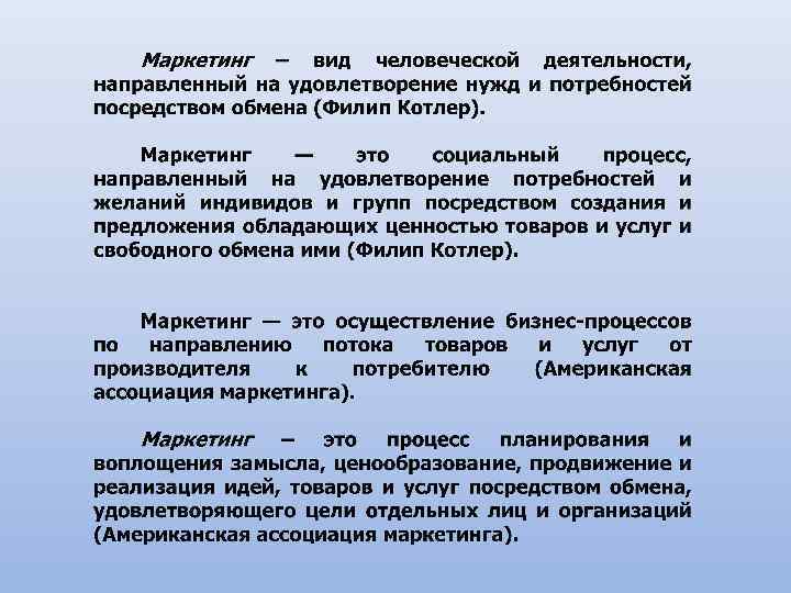 Концепции маркетинга 1. Концепция совершенствования производства (затратная, производственная) 2. Концепция совершенствования товара 3. Концепция интенсификации коммерческих усилий 4. Концепция маркетинга 5. Концепция социально-этического маркетинга