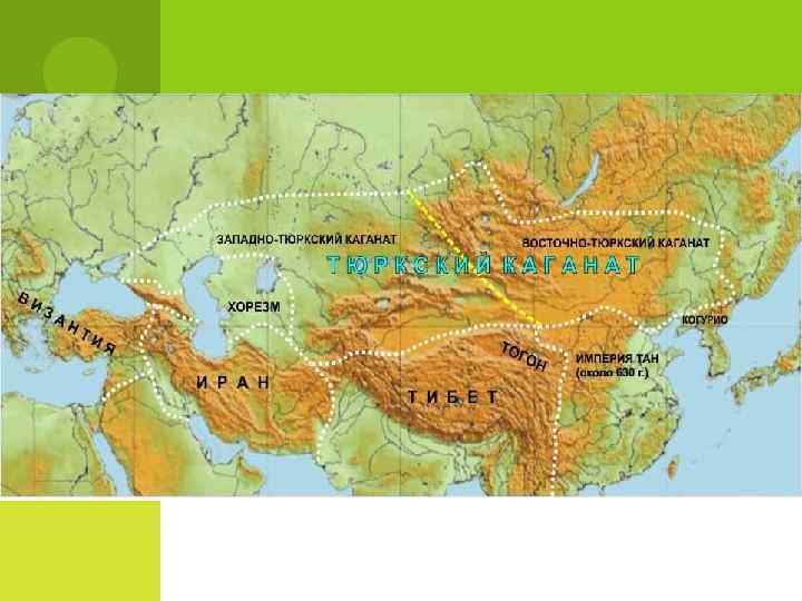 Конец 60 -х гг. в. VI Тюркский каганат имел отношения с Византией, Ираном, Китаем Вел борьбу за контроль над Великим Шелковым путем (связывал Дальний Восток со Средиземноморьем) В 70 -е гг. VI века простирался от Маньчжурии до Босфора