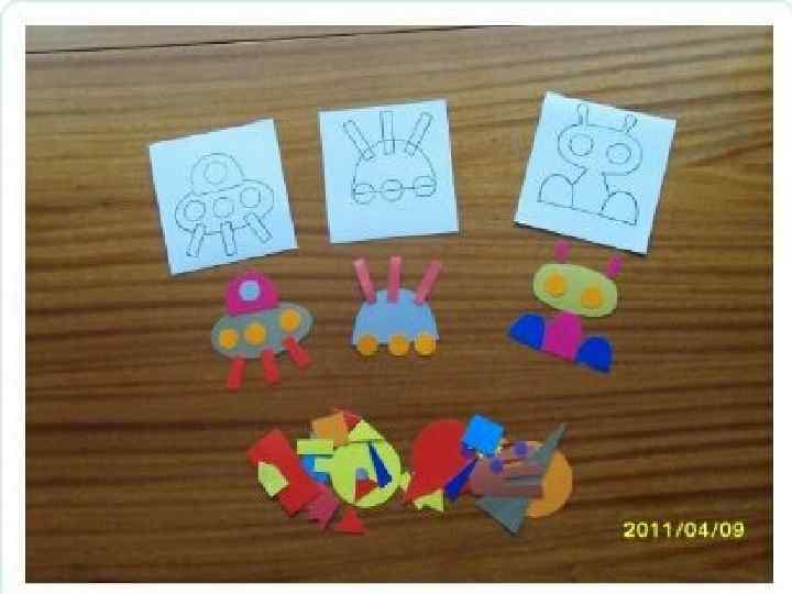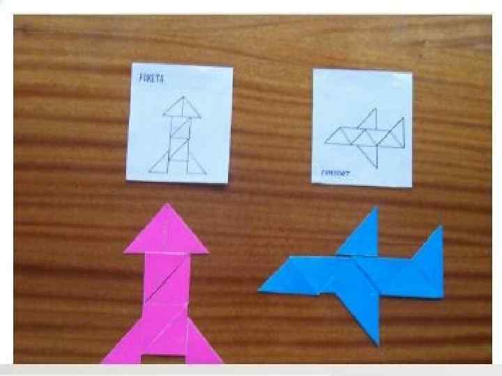 «Космос» дидактикалық ойыны 4 -5 жас. Мақсаты: балалардың ойлау қабілетін дамытады, шығармашылық қиялын және есте сақтау қабілетін дамытады. Қатысушылар саны: 1 -12 ойын барысы: үстел үстіне 12 үлкен әр түрлі түстегі геометриялық пішіндер берілген. Балалар берілген карточкалардағы суреттерге (мыс: зымыран, күн, инопланетянен) қарап, геометриялық пішіндерден суреттер құрастыру керек. «Үшбұрыштан құрастыру» Мақсаты: ойлау қабілетін, шығармашылық қабілетін, қиялын дамыту. Ойын үлкен карточкалар мен түрлі-түсті үшбұрыштардан тұрады. Ойын барысы: балалар берілген үлгі бойынша түрлі-түсті үшбұрыштардан суреттер құрастыру қажет.